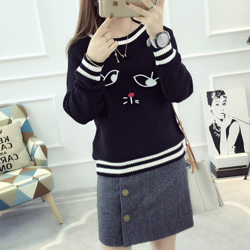 套頭毛衣女學生韓版短款圓領長袖針織衫春裝新款女裝刺繡上衣