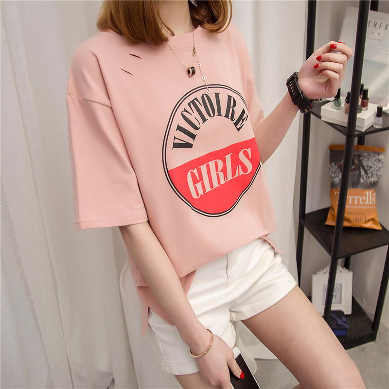 女裝春裝新款潮短袖t恤女寬松中袖韓版學生開叉夏季體恤百搭