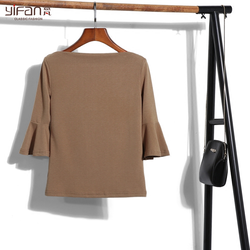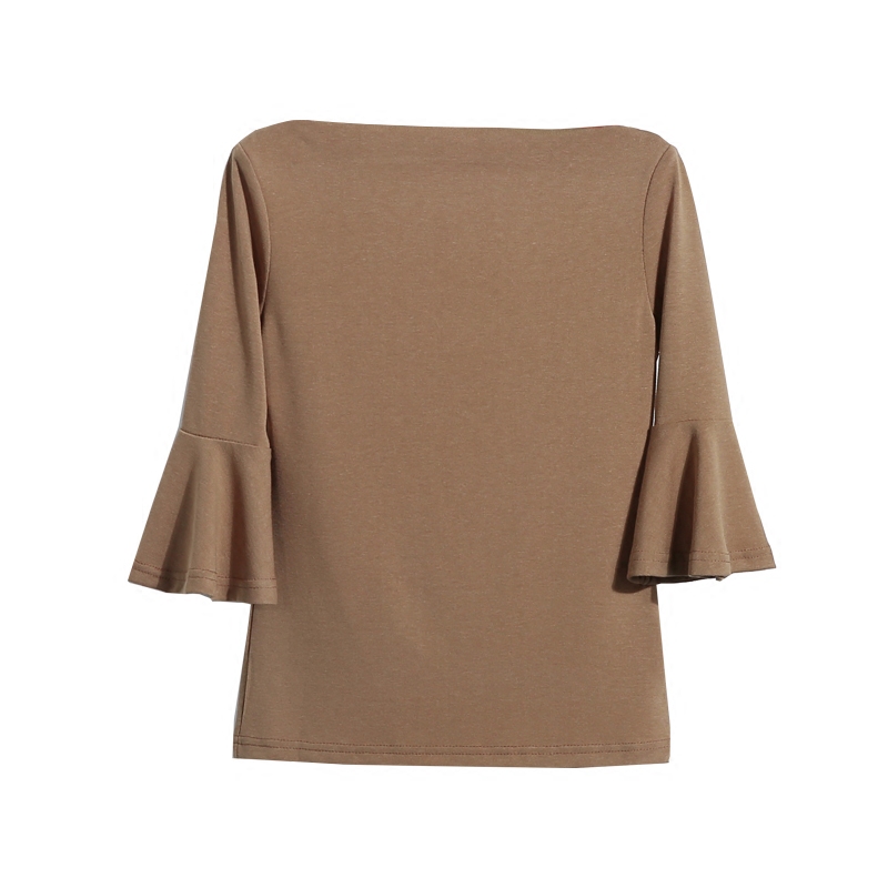 季夏新款韓版百搭純色百搭一字領打底衫七分袖T恤上衣女喇叭袖潮