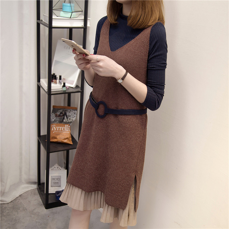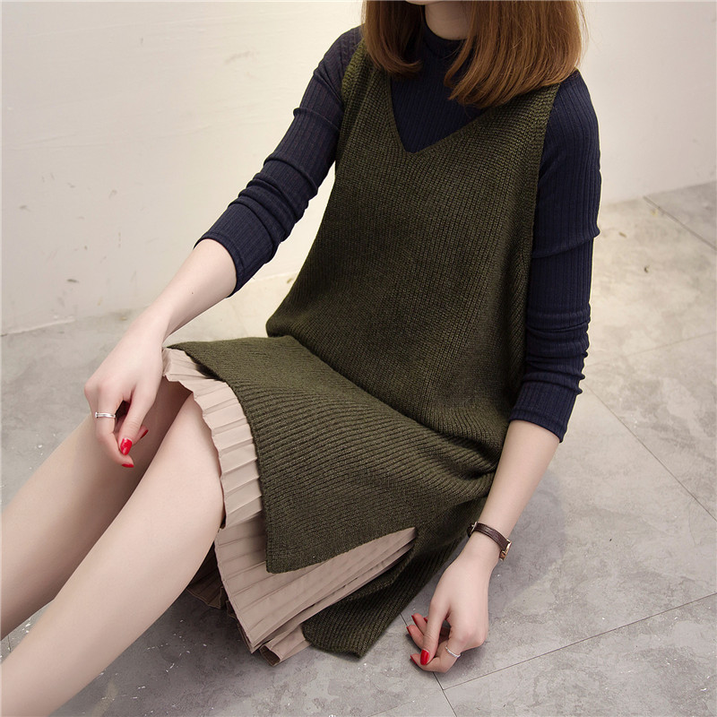 女裝春裝新款潮寬松韓版兩件套針織衫套頭毛衣女中長款背心裙