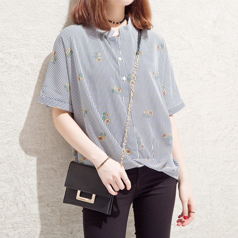 / 夏裝新款女裝港味條紋襯衫女短袖甜美chic上衣小清新韓范寬松