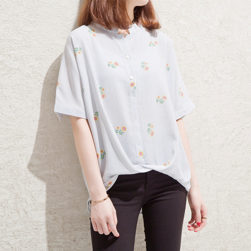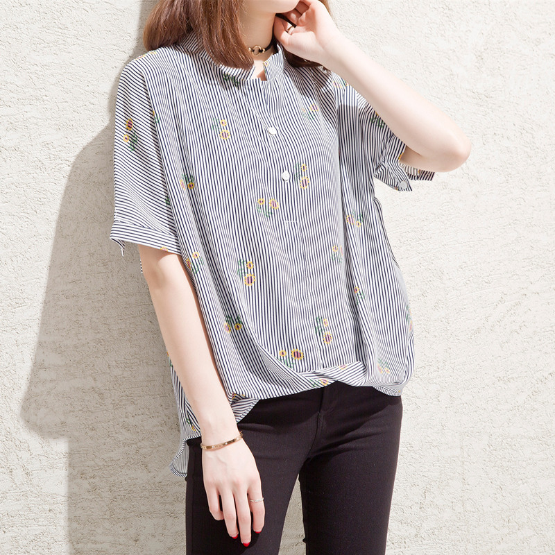 夏裝新款女裝港味條紋襯衫女短袖甜美chic上衣小清新韓范寬松