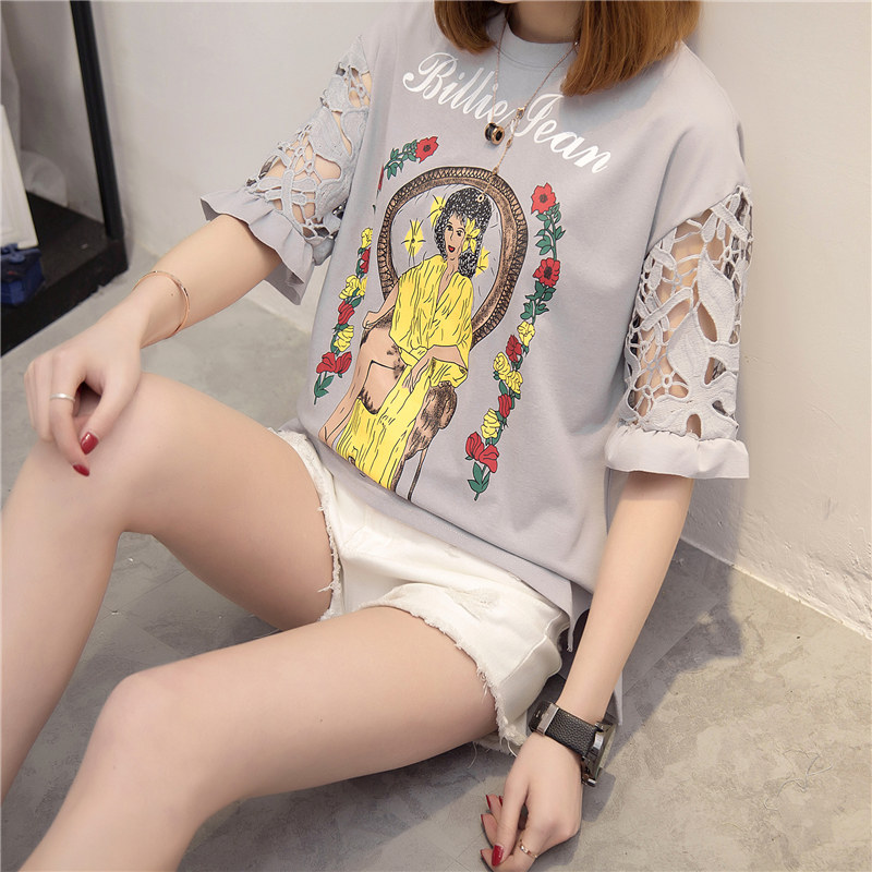 女裝春裝新款韓版潮白色蕾絲t恤女中長袖寬松百搭打底體恤衫